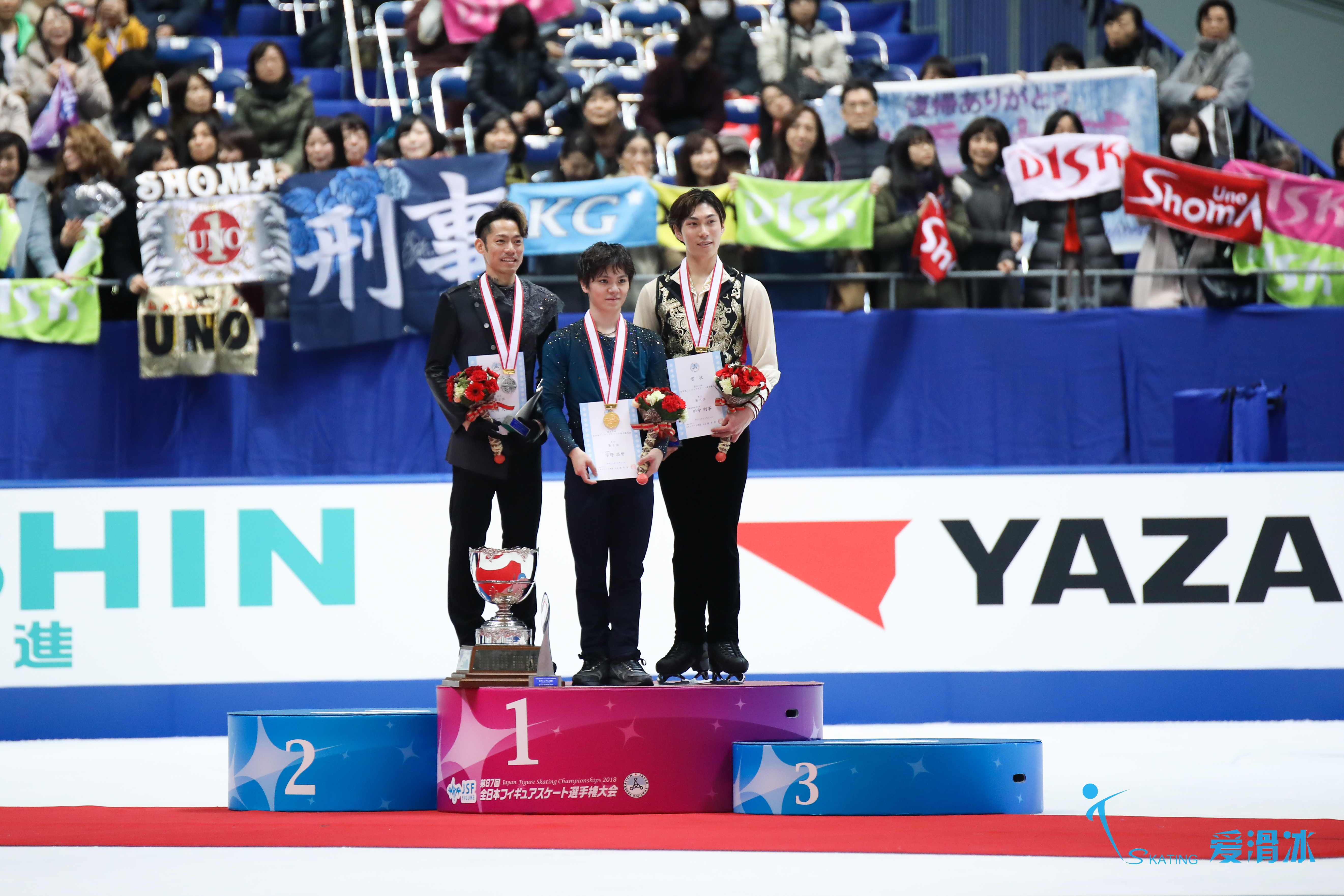 全日男单自由滑比赛终了,宇野昌磨毫无悬念夺冠,高桥大辅复出后第一次全日比赛拼尽全力,虽然最终出现一些失误,依然拼得一枚银牌,田中刑事凭借自由滑的成绩反超登上领奖台。